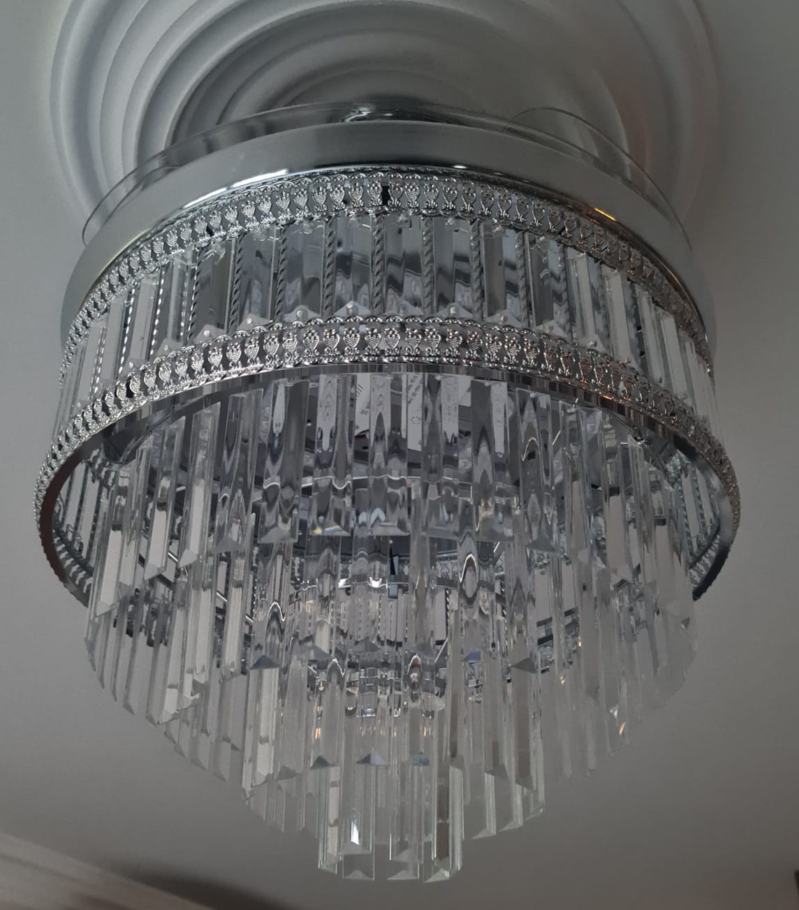 Estructura metálica en acabado cromado con cristales decorativos que iluminan con un efecto elegante y cálido.