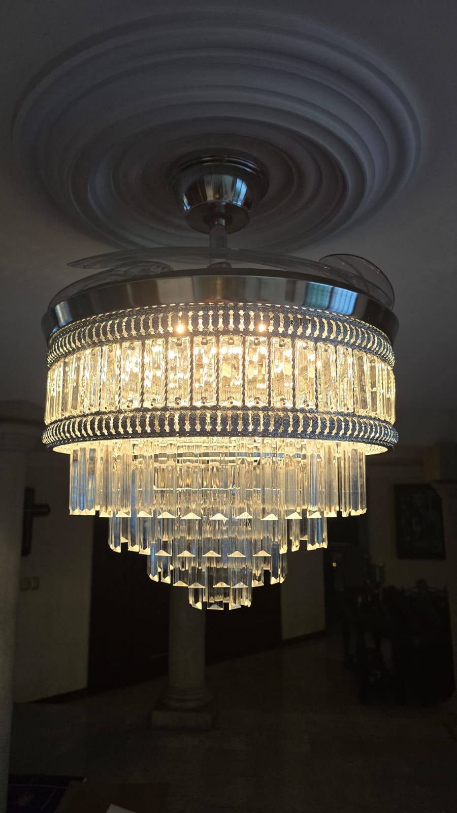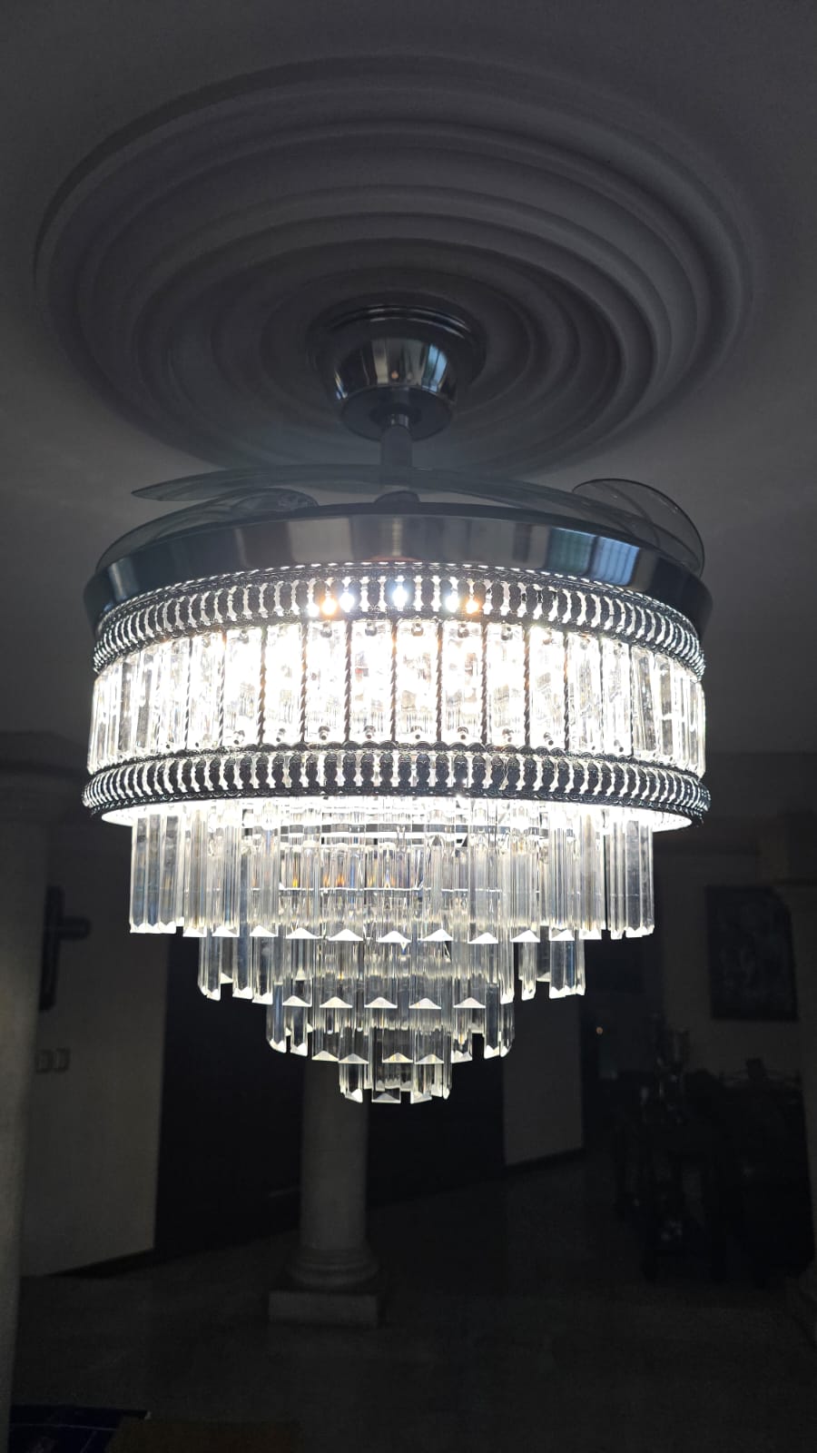 Transforma cualquier espacio con este espectacular ventilador retráctil tipo candelabro, una pieza que combina lujo, iluminación premium y funcionalidad inteligente. Su diseño moderno con cristales cortados de alta calidad ofrece un brillo único que realza salas, comedores, recibidores o recámaras con un ambiente sofisticado.